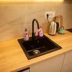 Genießen Sie den Komfort eines Badezimmers im Apartment Vila Bella The Petica, das mit einem Haartrockner und Hausschuhen ausgestattet ist.